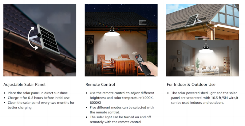 4. Aplicare largă Aceste lumini solare pentru șopron au 3 temperaturi de culoare: 4000K-6000K (cald, alb, culori mixte), 3 în 1, care pot satisface nevoile diferitelor medii și scenarii.