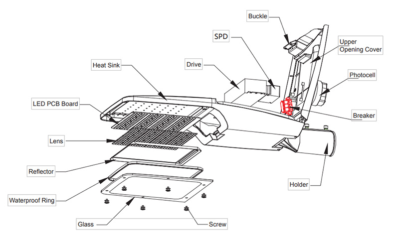 | Disponibil la cerere | Compatibil cu energie solară, soclu NEMA (3/5/7 pini), soclu ZHAGA, soclu scurt, fotocelulă, senzor de mișcare, NTC, OLC, reglare DALI | |||||||